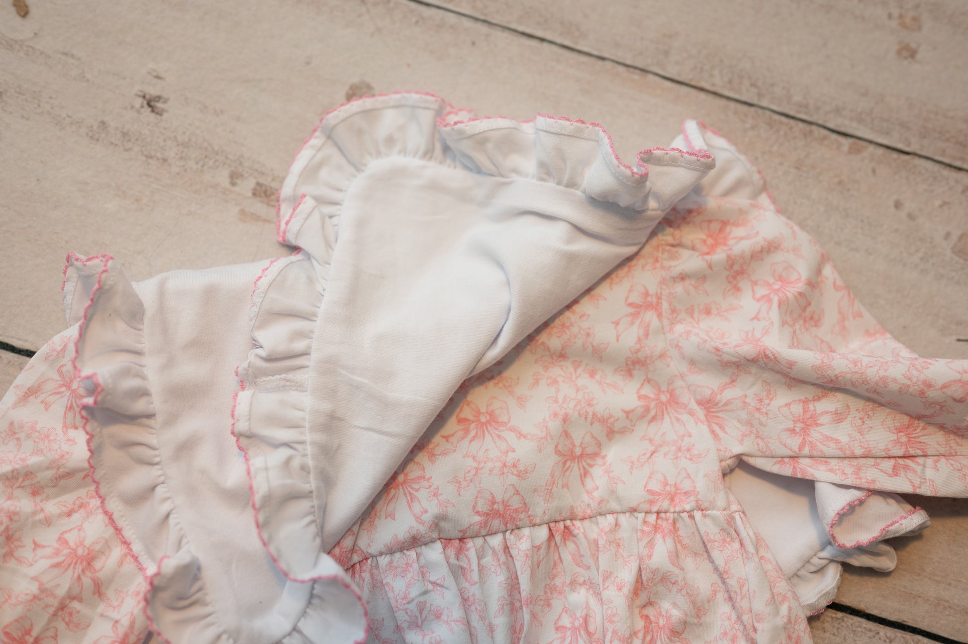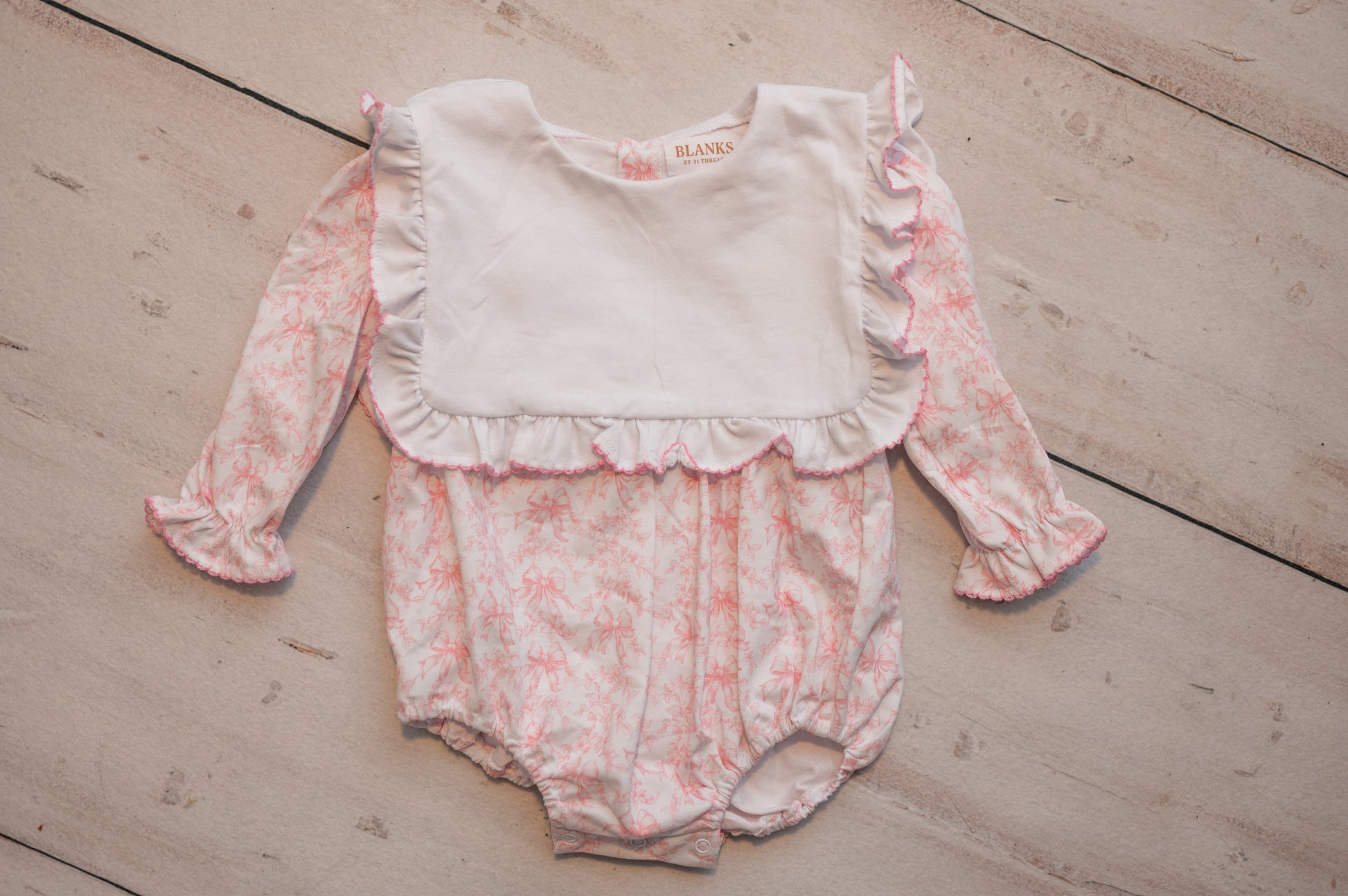 95% cotton 5% spandex for that perfect amount of stretch! Slightly oversize & detachable bib with picot trim